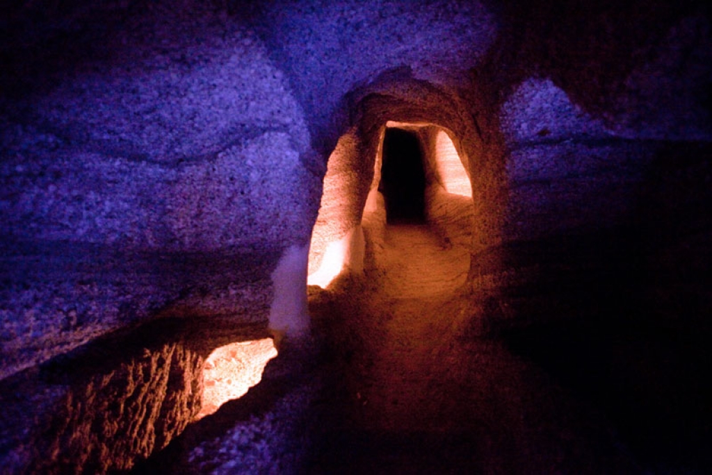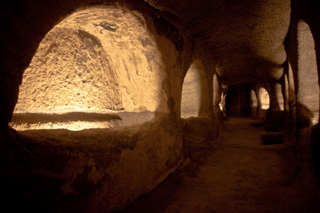This labyrinth complex is composed of three long -initially separated- subterranean colonnades (A,B,C) carved in the porous volcanic stone, five corridors and one rectangular burial chamber in the form of cubicula of the Roman Catacombs. Each Catacomb is of a different width (1-5 meters) and a different height (1,60-2,50 meters). Its total length is 185 metres and today 126 “arkosolia” (carved arched tombs) are preserved in the inner sides of the colonnades